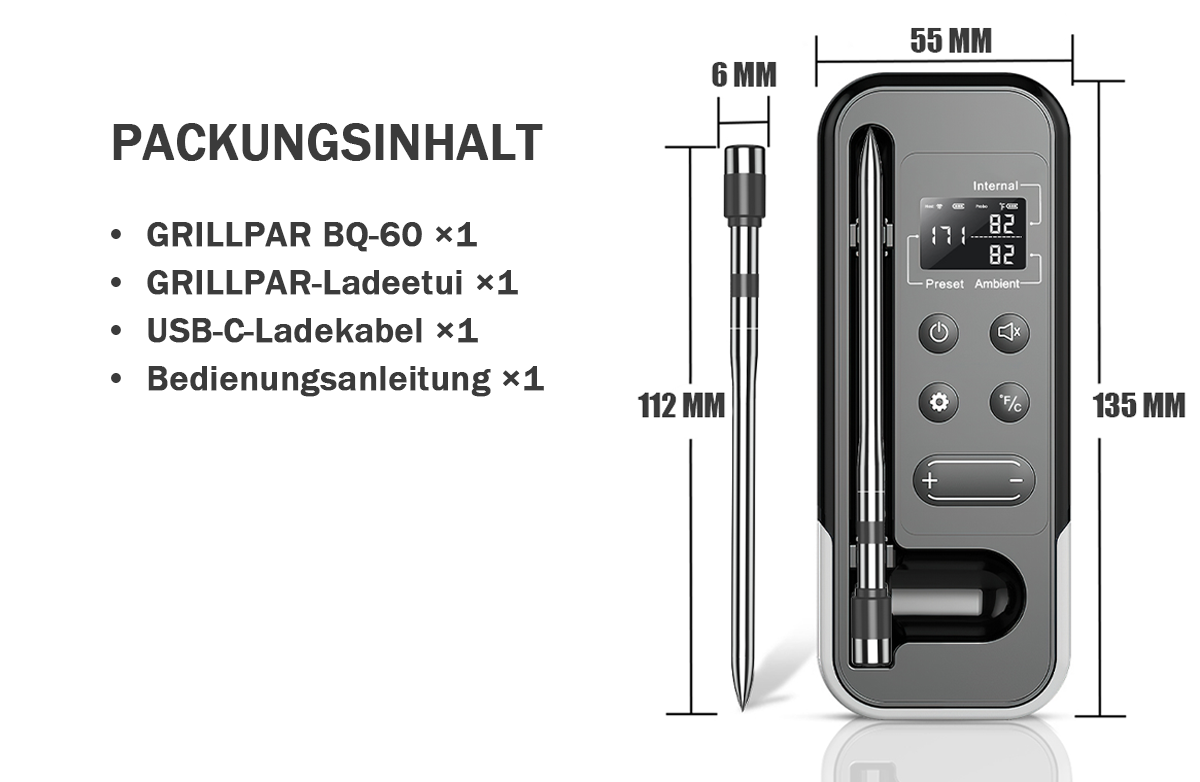 Grillpar BQ-60 – Kabelloses Bluetooth-Grillthermometer für Fleisch, Smoker und Grill